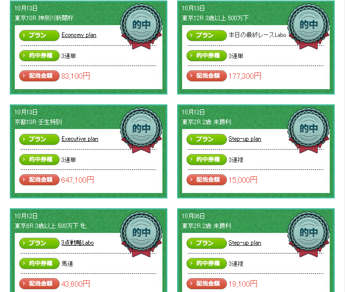専門のスタッフが対応し、プロが厳選した情報を指示通りに行っていくサイトで膨大な情報によりさまざまな馬券を買うことが出来る。また、会員の中には未経験者が20〜30%を占めているサイトです。