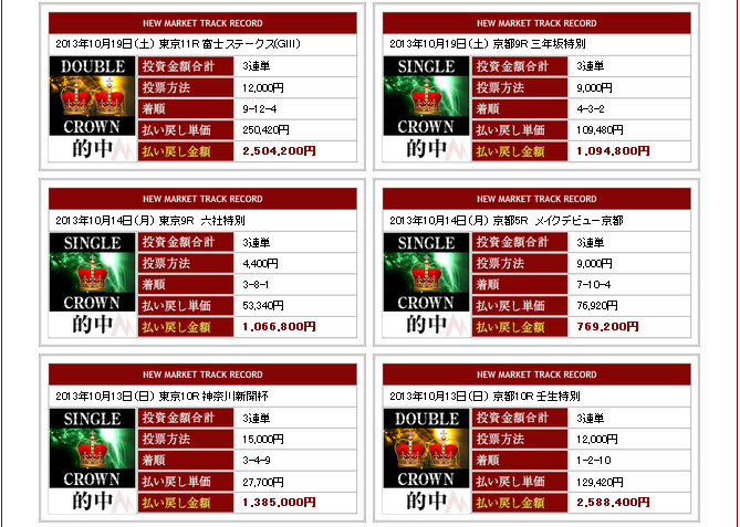 優良投資競馬会社に在籍し業界の隅々まで熟知したスペシャリスト達による高い分析力兼ね備えていると言うだけあって最も的中が難しい三連単をいくつも的中している。