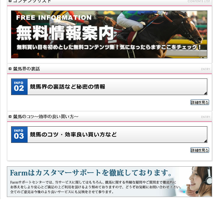 サイトリニューアルを行い提供サービス全てを改新。契約する関係者の数を増やし、的中する可能性を更に高めています。その影響は無料情報にも現れており、今競馬サイトの中で最も旬な会社として人気を集めています。まずは1鞍提供の無料情報をお試しいただくことをおすすめします。