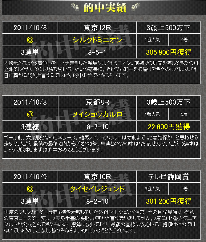 先週10月9日の的中実績ではかなりの高額的中を連続させたようで、