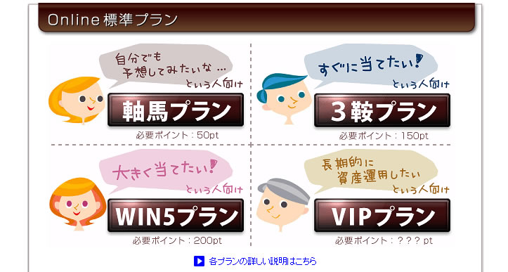 基本プランは、軸馬プラン、3鞍プラン、WIN5プラン、