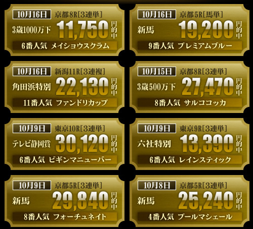 全て万馬券になっている。高い配当の的中実績が掲載されており、