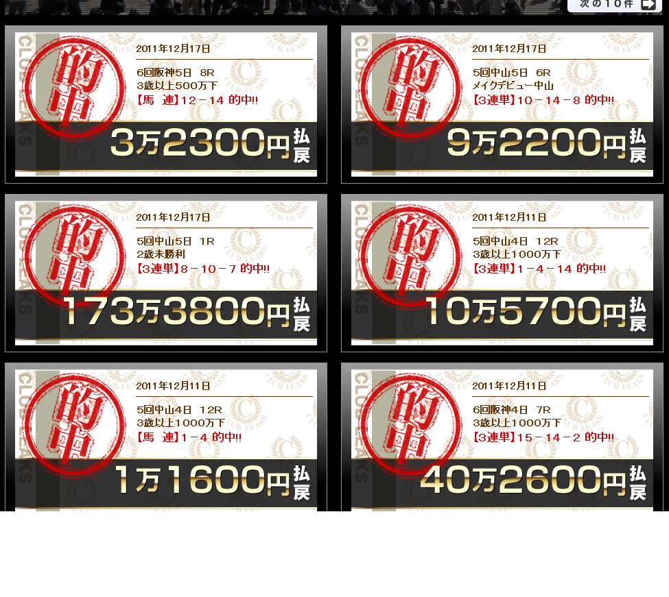 サイトリニューアルを行い提供サービス全てを改新。契約する関係者の数を増やし、的中する可能性を更に高めています。その影響は無料情報にも現れており、今競馬サイトの中で最も旬な会社として人気を集めています。まずは1鞍提供の無料情報をお試しいただくことをおすすめします。
