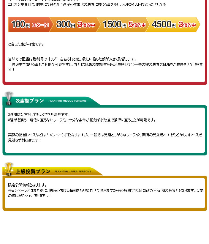 プランでは上記の単勝コロガシ、3連複プラン、上級投資プランが