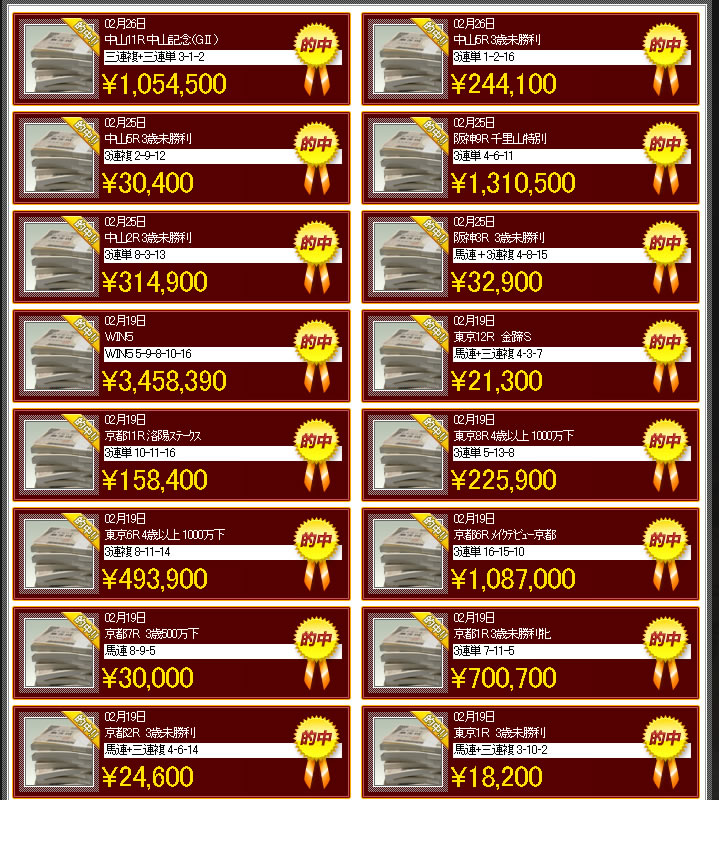 的中実績ではWIN5による的中で過去最高300万超えの的中を実現しており、