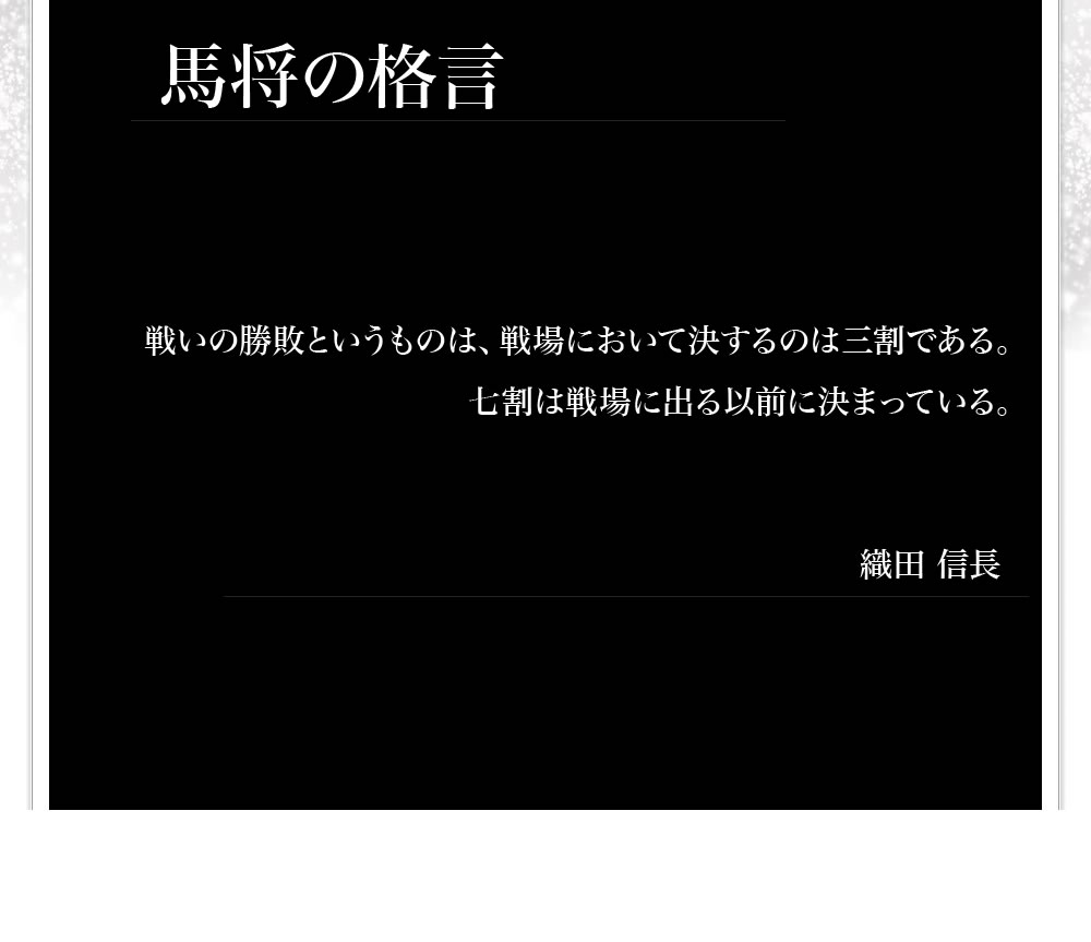 戦国時代の雰囲気を全面に押し出し、有名武将の言葉を借りたムード作りが