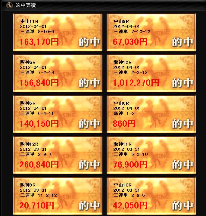 的中実績では簡易な記載しており、レース名と回収額が掲載されている。