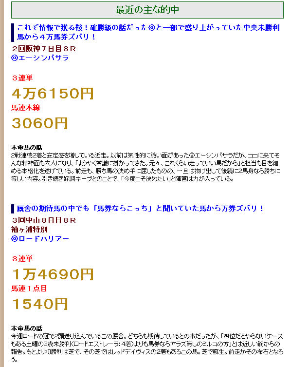 的中実績ではレース名と馬券種、コメントが付いたものが掲載されており、ところどころ