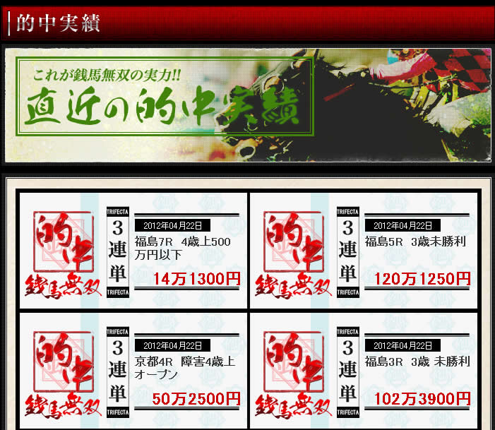 が記載され、高額な的中実績が並んでいる。シアkしながら回収率などは算出