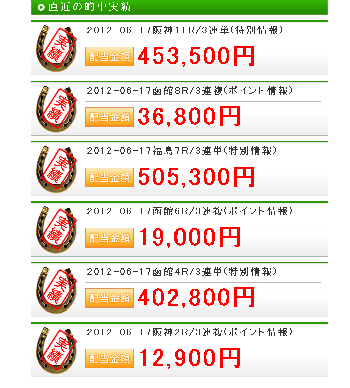 実績については3連単・3連複による的中実績が多く、払戻額は数百万に達するものが多く、
