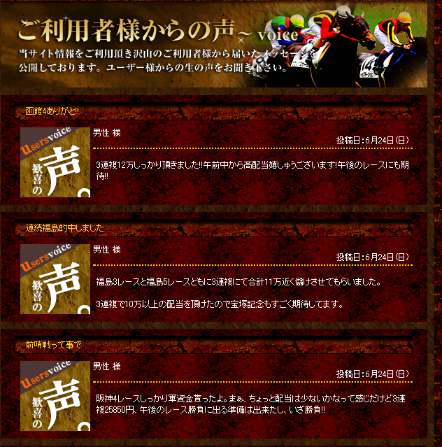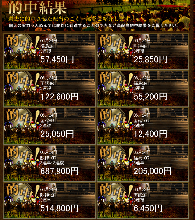 が記載され、高額なものから低額なものまで的中実績が並んでいる。