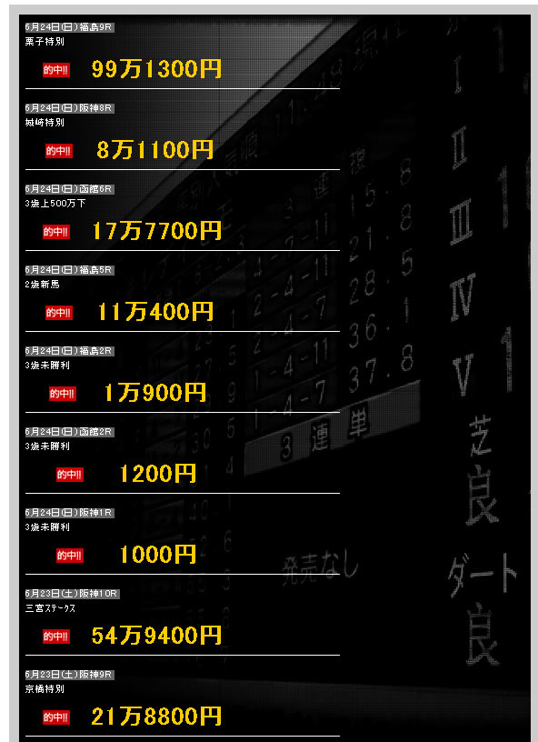 が記載され、高額なものから低額なものまで的中実績が並んでいる。