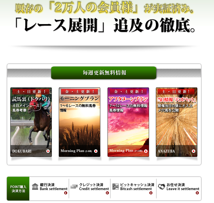 サイトリニューアルを行い提供サービス全てを改新。契約する関係者の数を増やし、的中する可能性を更に高めています。その影響は無料情報にも現れており、今競馬サイトの中で最も旬な会社として人気を集めています。まずは1鞍提供の無料情報をお試しいただくことをおすすめします。